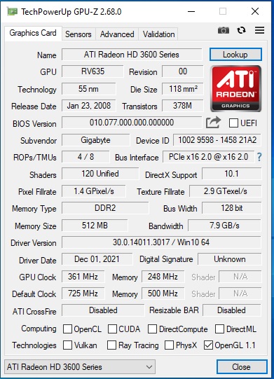 Graphic Card ATI Radeon 3600